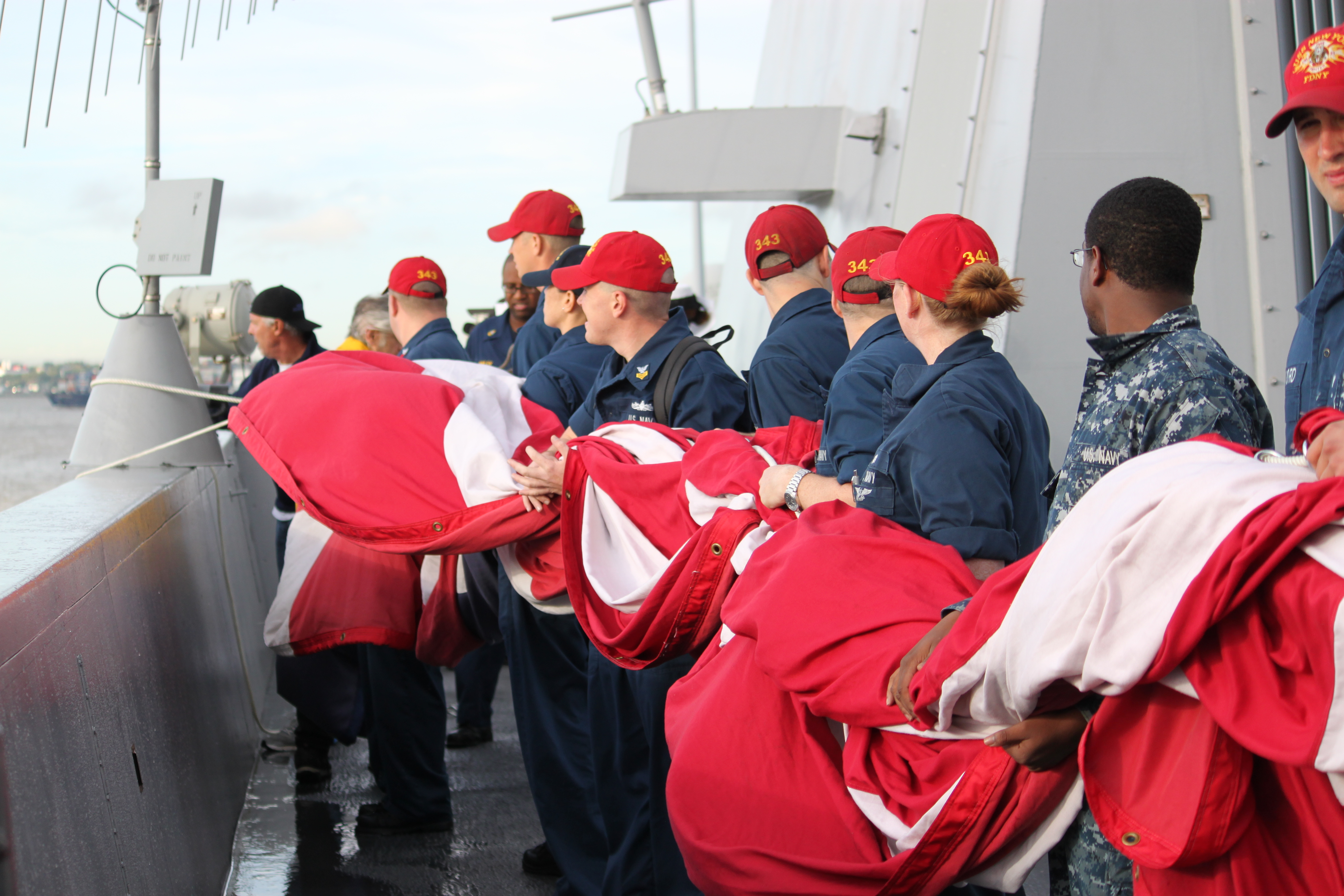 ship paused at Ground Zero, it's entire crew along with members of the FDNY and the NYPD rendered honors
